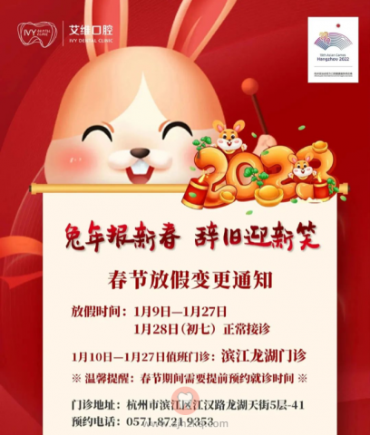 杭州艾维口腔2023春节放假时间变更调整 杭城看牙记 • 2023年1月21日 10:35 • 杭州看牙动态 日月其迈,岁律更新,虎走留福,玉兔迎春。根据国务院关于法定节假日的规定,结合门诊部实际工作情况,艾维口腔决定于2023年1月28日(初七)开工。 春节放假时间具体变更安排如下: 值此新春佳节,艾维口腔祝愿大家岁月常欢愉,年年常胜意,健康顺遂,万福骈臻。 来源:杭州艾维口腔 本文内容源自网络仅供参考,不作为诊断医疗依据,更多查询请 → 在线咨询客服
