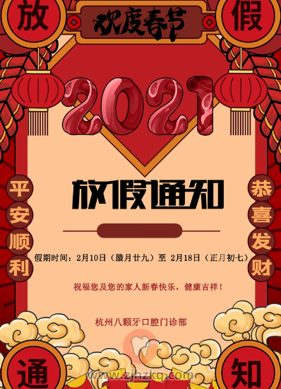 杭州八颗牙口腔2021春节假期安排 杭城看牙记 • 2021年2月8日 18:18 • 杭州看牙动态 杭州八颗牙门诊部位于古运河畔,2020年新筹建单位,本着笑露八颗牙的微笑服务理念,以助患者笑露八颗牙为己任。为患者提供更优解决方案。门诊拥有义齿加工厂,为临床提供强大的技术支撑,医技交流畅通,让每一幅义齿都精致可靠,使我们的每一个患者受益。门诊创始团队致力于打造品牌口腔直营连锁。 杭州八颗牙口腔门诊部向一直支持着我们的您送福!祝您新年快乐!2021春节假期安排如下: 本文内容源自网络仅供参考,不作为诊断医疗依据,更多查询请 → 在线咨询客服