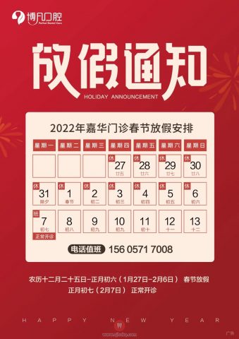 杭州博凡口腔嘉华门诊春节停诊开诊时间 杭城看牙记 • 2022年1月29日 21:55 • 杭州看牙动态 博凡口腔嘉华门诊放假安排 2022年春节放假调休具体安排如下:1月27日至2月6日放假,共11天。2月7日嘉华门诊恢复正常营业。祝大家平安祥和过春节,虎年新年快乐! 本文内容源自网络仅供参考,不作为诊断医疗依据,更多查询请 → 在线咨询客服