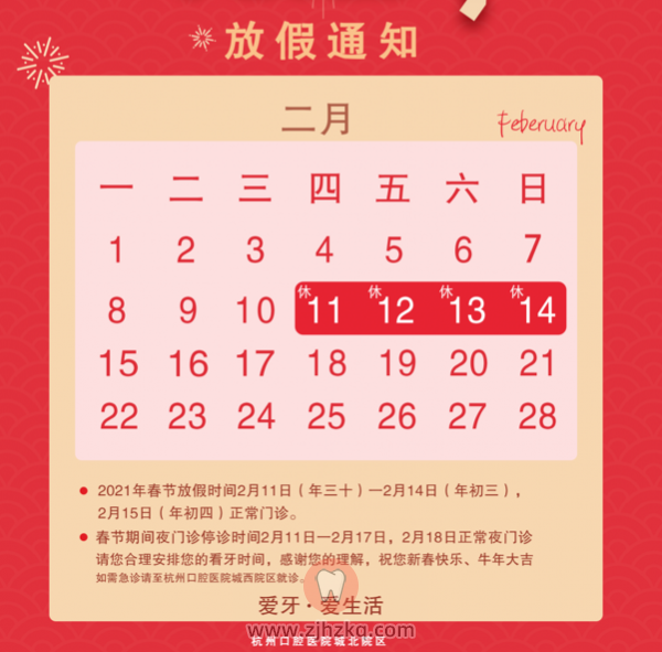 杭州口腔医院城北分院2021春节门诊时间安排 杭城看牙记 • 2021年2月8日 18:15 • 杭州看牙动态 杭州口腔医院城北院区春节门诊时间 2021年2月11日-2月14日(除夕-正月初三)停诊四天 2021年2月15日起(正月初四起)正常门诊8:30–17:30 2021年2月18日起(正月初七起)恢复夜门诊8:30–20:30 双休日及节假日无夜门诊假期如需急诊请至城西院区 本文内容源自网络仅供参考,不作为诊断医疗依据,更多查询请 → 在线咨询客服