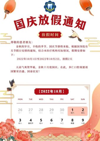 杭州多仁口腔2022国庆放假通知 杭城看牙记 • 2022年9月28日 10:37 • 杭州看牙动态 尊敬的患者朋友: 金秋的岁月,丰收的季节。国庆节即将来临,根据国务院有关节假日安排的通知,结合本医疗机构实际情况,假期安排如下: 2022年10月1日至2022年10月2日,放假2天 天高气爽贺华诞,金秋十月度国庆。在此,多仁口腔祝愿祖国繁荣昌盛、国泰民安! 来源:杭州多仁口腔 本文内容源自网络仅供参考,不作为诊断医疗依据,更多查询请 → 在线咨询客服