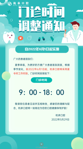 杭州杭承口腔执行夏令时作息时间 杭城看牙记 • 2022年5月30日 17:20 • 杭州看牙动态 为更好满足大家的就诊时间需求,杭承口腔从6月1日(周三)起,门诊时间将执行夏令时作息时间。 具体时间安排如下: 本文内容源自网络仅供参考,不作为诊断医疗依据,更多查询请 → 在线咨询客服