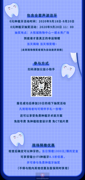 杭口城北免费种植牙抽奖活动 杭城看牙记 • 2020年9月19日 10:41 • 杭州看牙动态 杭州口腔医院城北分院 惊喜推出爱牙日活动 920当天前往大悦城现场抽奖 即可有机会0元拥有种植牙 更有大量优惠套餐等你来抢 本文内容源自网络仅供参考,不作为诊断医疗依据,更多查询请 → 在线咨询客服