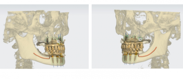 若采用传统的种植治疗方式,需要先切开牙龈,并在固定修复下颌时,至少在符合生物力学的条件下植入四颗种植体,其中两颗种植体在符合生物学的要求下距离神经管均必须精准控制在正好3mm距离。其手术难度大、术中时间长、手术风险高,超出了患者及家属的承受范围。
