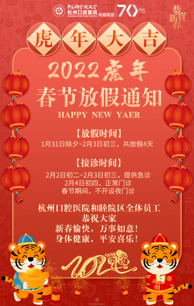 杭州口腔医院和睦院区2022春节门诊放假通知 杭城看牙记 • 2022年1月22日 21:59 • 杭州看牙动态 有家的地方,才叫年过年回家,防疫不可松懈,记得“罩”顾好自己才能照顾好家人祝大家新年快乐、平安喜乐 本文内容源自网络仅供参考,不作为诊断医疗依据,更多查询请 → 在线咨询客服