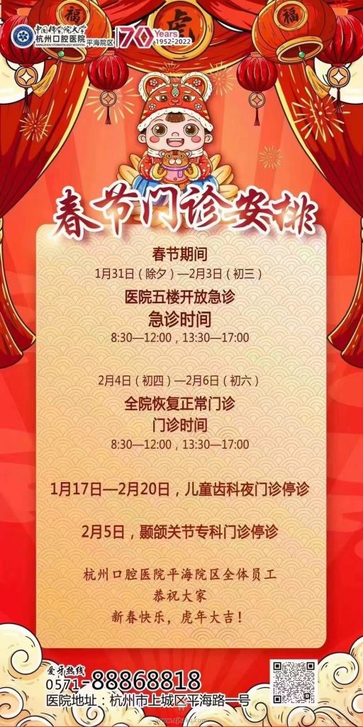 杭州口腔医院平海院区2022年春节放假开诊时间 杭城看牙记 • 2022年1月27日 12:47 • 杭州看牙动态 杭州口腔医院平海院区2022年春节放假开诊时间如下: 本文内容源自网络仅供参考,不作为诊断医疗依据,更多查询请 → 在线咨询客服