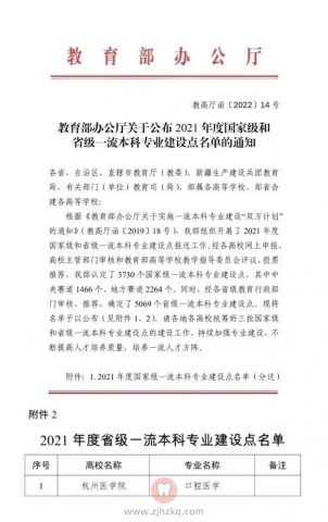 近日,教育部办公厅下发《教育部办公厅关于公布2021年度国家级和省级一流本科专业建设点名单的通知》(教高厅函〔2022〕14号),杭州医学院存济口腔医学院口腔医学专业获批浙江省一流本科专业建设点。