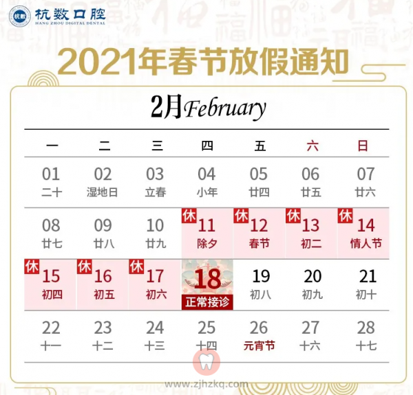 为确保大家在春节期间能合理安排时间正常就诊,杭数口腔将2021年春节开诊时间作如下安排: