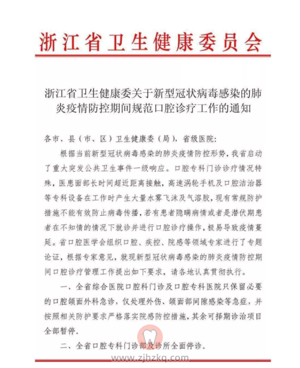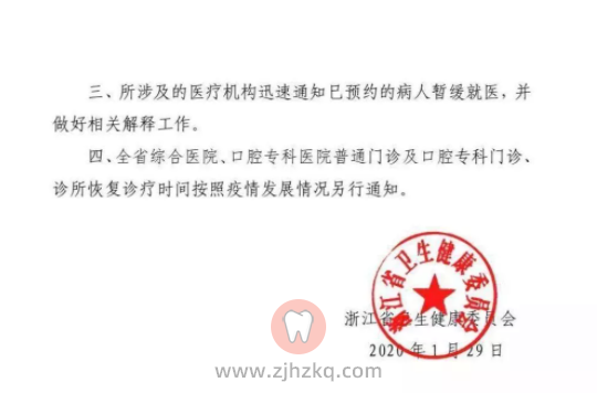 2020年1月29日,浙江省卫生健康委发布关于新型冠状病毒感染的肺炎疫情防控期间规范口腔诊疗工作的通知: