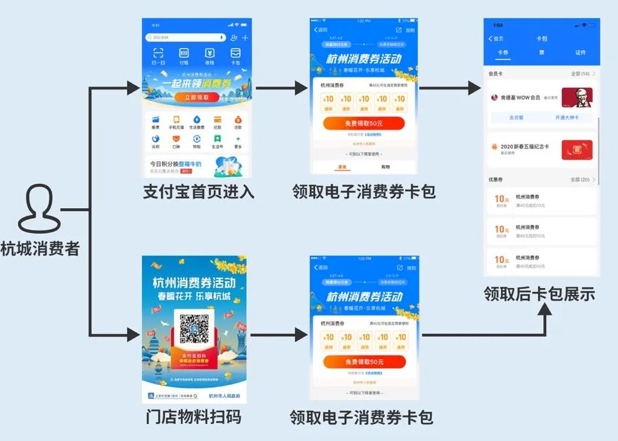 在杭人员可从支付宝首页专区入口或支付宝搜索“杭州”进入“杭州消费券”页面,点击申领消费券卡包(消费券具体内容及使用规则详见支付宝页面)。