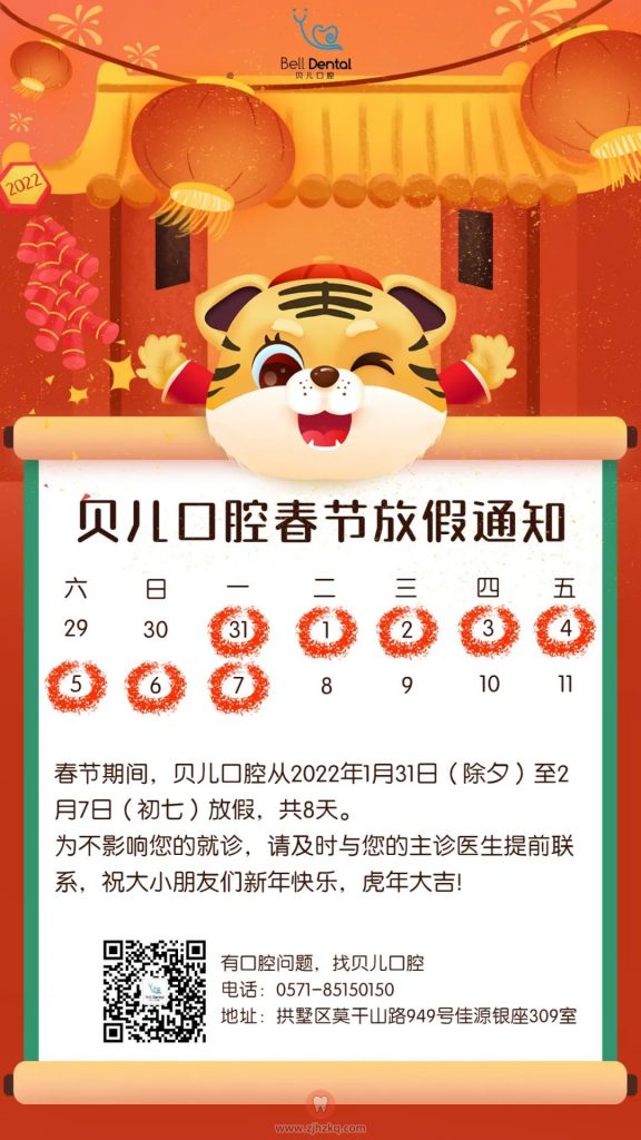 杭州贝儿口腔2022年春节放假开诊时间 杭城看牙记 • 2022年1月28日 10:50 • 杭州看牙动态 还有三天就是除夕了!杭州贝儿口腔提前给大家拜个早年祝大家阖家团圆!新春快乐! 近期杭州疫情形势严峻大家尽量少外出,外出一定要戴好口罩春节期间杭州贝儿口腔放假安排如下大家春节假期不要跑空啦~ 本文内容源自网络仅供参考,不作为诊断医疗依据,更多查询请 → 在线咨询客服