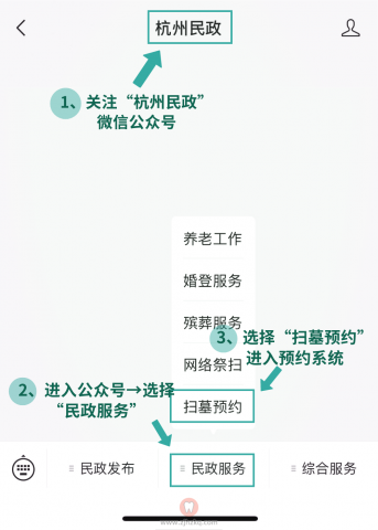 即日起,市民可关注“杭州民政”微信公众号,进入公众号→选择“民政服务”→“扫墓预约”进入预约系统。