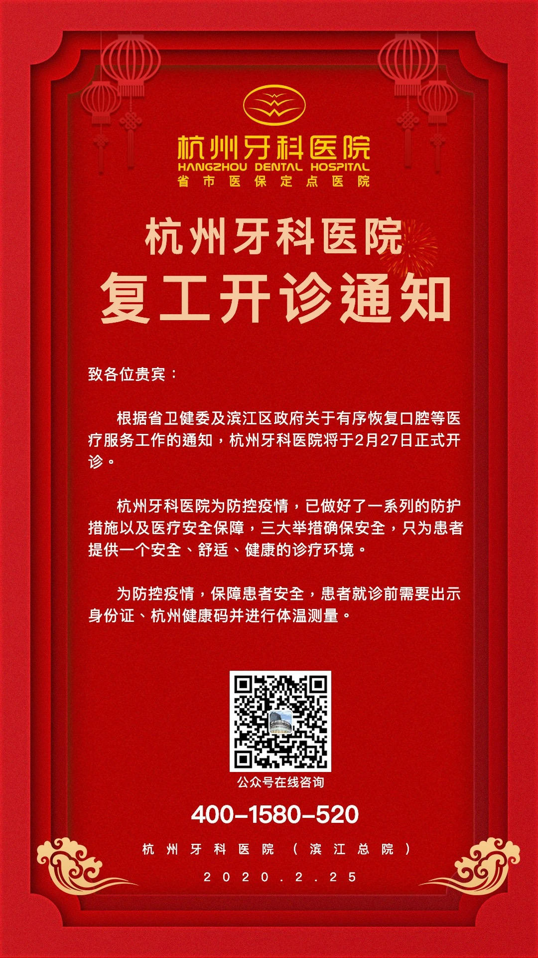 根据省卫健委及滨江区政府关于有序恢复口腔等医疗服务工作的通知,杭州牙科医院将于2月27日正式开诊。