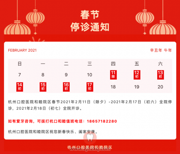 杭州口腔医院和睦院区2021年春节停诊安排 杭城看牙记 • 2021年2月5日 14:02 • 杭州看牙动态 2021年2月3日 距离牛年新春 还有7天 春节倒计时7天 新装备、新笑容 你准备好了吗? 杭州口腔医院和睦院区 已经准备完毕 春节停诊通知 杭州口腔医院和睦院区春节2021年2月11日(除夕)-2021年2月17日(初六)全院停诊,2021年2月18日(初七)全院开诊。 如有爱牙咨询,可拨打杭口和睦值班电话:18657182280 杭州口腔医院和睦院区祝您新春快乐、阖家安康。 本文内容源自网络仅供参考,不作为诊断医疗依据,更多查询请 → 在线咨询客服