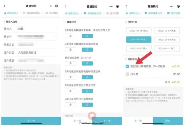 3、选择就诊人,填写问卷,选择项目后提交预约;