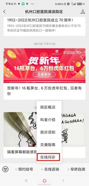 杭州口腔医院湖滨院区推出在线问诊 杭城看牙记 • 2022年1月24日 17:17 • 杭州看牙动态 值此举家团圆的时刻,杭州口腔医院湖滨院区院区全体人员,停诊不忘使命,让这个春节,更显温暖。 线上问诊实时、免费!! 1、关注“杭州口腔医院湖滨院区”微信公众号,点击公众号下方“在线咨询”栏目 2、点击“在线问诊” 3、通过此页面了解各科诊疗项目及医生,选择想要咨询的医生 4、点击右下角“咨询医生” 温馨提醒:请给出些耐心等待回复! 本文内容源自网络仅供参考,不作为诊断医疗依据,更多查询请 → 在线咨询客服