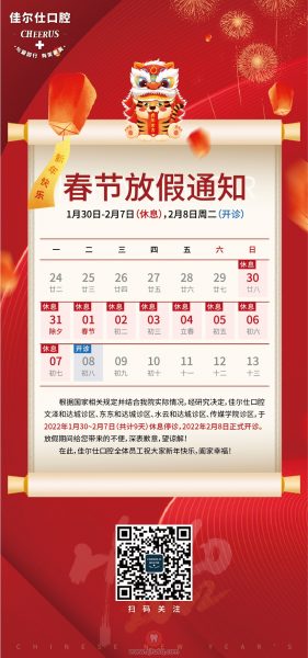 佳尔仕口腔2022年春节放假通知 杭城看牙记 • 2022年1月25日 11:15 • 杭州看牙动态 新年伊始,万象更新!感谢大家对佳尔仕口腔多年来支持与信任2022年我们定不付所托一如既往,以精湛的技术为大家服务! 新春来临之际佳尔仕口腔全体员工给大家拜年啦!祝大家在新的一年里诸事大吉,事事顺心,虎年吉祥如意! 新的一年一起如虎添翼! 本文内容源自网络仅供参考,不作为诊断医疗依据,更多查询请 → 在线咨询客服