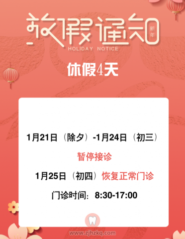 杭州口腔医院嘉兴分院2023年春节放假时间安排 杭城看牙记 • 2023年1月16日 13:18 • 杭州看牙动态 春节门诊时间安排 他来了他来了他带着年味走来了新年将至大家是不是都已经在为春节做准备了?春节期间万一口腔有问题咋办?别怕杭州口腔医院嘉兴分院春节门诊时间安排! 杭州口腔医院嘉兴分院2023年春节过节门诊时间安排1月21日(除夕)至1月24日(正月初三)暂停接诊1月25日(正月初四)起门诊时间:8:30-17:00正常门诊! 来源:杭州口腔医院嘉兴分院 本文内容源自网络仅供参考,不作为诊断医疗依据,更多查询请 → 在线咨询客服