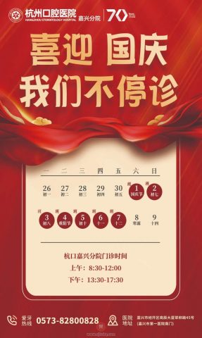 杭口嘉兴分院2022国庆不停诊通知 杭城看牙记 • 2022年9月29日 17:16 • 杭州看牙动态 国庆门诊通知National Day Holidays国庆七天小长假要来啦大家都即将开启休假、度假模式美食当前,吃吃喝喝更要注意口腔健康哦~ 十一不停诊,健康不打烊。为方便大家就诊,杭州口腔医院嘉兴分院10月1日-7日,国庆节期间门诊时间照常。 来源:杭州口腔医院嘉兴分院 本文内容源自网络仅供参考,不作为诊断医疗依据,更多查询请 → 在线咨询客服