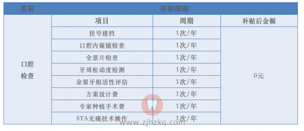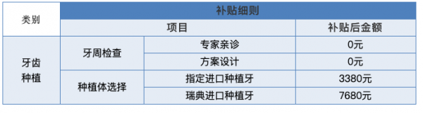 1、八大项目全额补贴:包含①挂号建档 ②口腔内窥镜检查 ③全景片检查 ④牙周松动度检测 ⑤余留牙根活性评估 ⑥方案设计费 ⑦专家种植手术费 ⑧无痛技术操作;