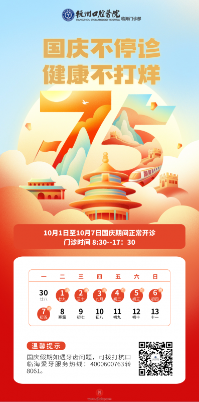 杭州口腔医院临海分院节假日门诊上班时间(以国庆为例) 杭城看牙记 • 2024年10月4日 10:54 • 杭州看牙动态 守护口腔健康不打烊,杭口临海门诊部国庆假期照常开诊! 10月1日至10月7日国庆期间正常开诊 门诊时间 8:30–17:30 本文内容源自网络仅供参考,不作为诊断医疗依据,更多查询请 → 在线咨询客服