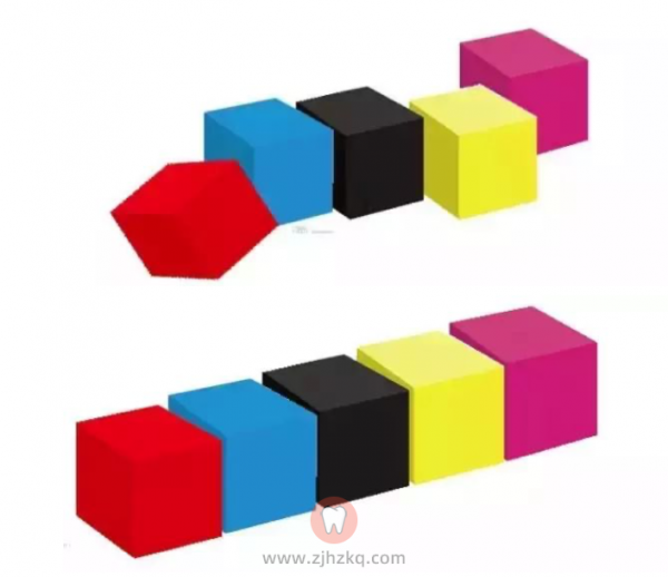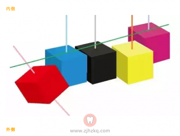 在明确了“做牙冠就必须牙体预备”之后,我们来看看,下面这样的5颗牙齿(立方体表示的是牙冠部分),能否通过牙冠修复的方法,排整齐,并且不伤害牙齿健康呢?