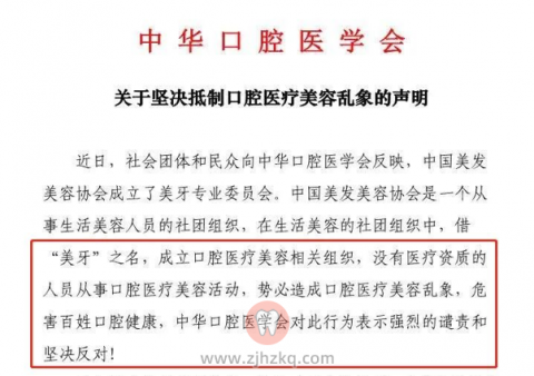 近日,中华口腔医学会发布了一则关于坚决抵制口腔医疗美容乱象的声明,声明中指出国家医师资格证书分类中根本不存在美牙师证书,并对没有医疗资质的人员从事口腔医疗美容项目表示强烈的谴责和坚决反对!