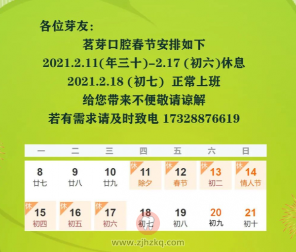 杭州茗芽口腔2021年春节期间门诊安排 杭城看牙记 • 2021年2月9日 22:42 • 杭州看牙动态 各位芽友意义非凡的2020年已过去感谢大家对我们的信任和厚爱值此春节即将到来之际茗芽口腔向大家拜个早年!祝愿大家牙好胃口好图片图片家庭和睦、事业顺利、牛年行大运! 假期畅享美食也莫忘好好护理口腔春节期间门诊安排如下 本文内容源自网络仅供参考,不作为诊断医疗依据,更多查询请 → 在线咨询客服