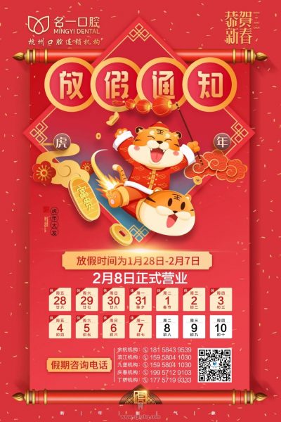 杭州名一口腔连锁2022年春节放假开诊时间 杭城看牙记 • 2022年1月28日 12:52 • 杭州看牙动态 祝大家新年快乐虎虎生威!勤洗手、多通风、减少聚集滨江加油!杭州加油! 在新的一年里,杭州名一口腔连锁全体工作人员祝大家新年快乐!身体健康、万事如意! 本文内容源自网络仅供参考,不作为诊断医疗依据,更多查询请 → 在线咨询客服