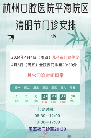 杭州口腔医院平海院区2024清明放假安排通知 杭城看牙记 • 2024年3月31日 21:16 • 杭州看牙动态 杭州口腔医院平海院区 清明节门诊安排 4月4日(周四)儿科夜门诊停诊 4月5日(周五) 全院夜门诊至20:30 其它门诊时间照常 门诊时间 08:30-12:00 13:30-17:00 周五夜门诊至20:30 本文内容源自网络仅供参考,不作为诊断医疗依据,更多查询请 → 在线咨询客服