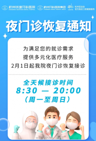 杭州钱塘牙科医院恢复夜间门诊 杭城看牙记 • 2023年1月31日 17:20 • 杭州看牙动态 春节过后,万象更新 满怀期盼,奔赴新一年 美味珍馐过后,也别忘记好好关爱我们的牙齿哦 为方便您就诊 明日(2月1日)起 我院夜门诊恢复接诊 接诊时间调整为: 周一至周日8:30-20:00 为了让您拥有更安心的就医体验 请提前预约就诊时间 来源:杭州钱塘牙科医院 本文内容源自网络仅供参考,不作为诊断医疗依据,更多查询请 → 在线咨询客服