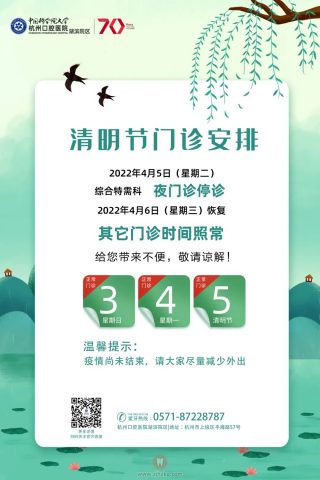 杭州口腔医院湖滨院区清明门诊安排 杭城看牙记 • 2022年4月1日 13:50 • 杭州看牙动态 清明门诊安排 2022年4月5日(周二)湖滨综合特需科夜门诊 停诊2022年4月6日(周三)恢复其他门诊时间照常夜门诊时间:17:00-20:00 请大家合理安排就诊时间给您带来不便,敬请谅解! 本文内容源自网络仅供参考,不作为诊断医疗依据,更多查询请 → 在线咨询客服