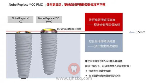 PMC种植体是在2020年刚推出的一款,是在PCC的基础上增添了“机械颈圈设计”,比较适合槽嵴骨不平整、牙周状况不好的人。