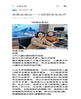 2020年12月07由湖北农村广播的微博认证号发布的《名医在身边》栏目中,就采访了三叶儿童口腔武汉**诊所医疗总监孙燕医生(武汉**医学博士)的专家采访。采访主题是关于儿童的口腔舒适化治疗的科普内容。