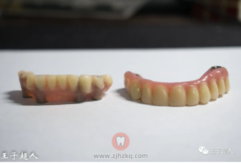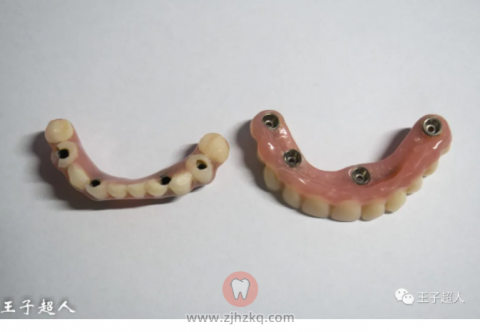 这是把试用义齿放上去后的样子(左侧下颌,右侧上颌),义齿和种植体用非常细小的螺丝连接固定。