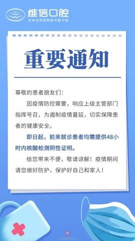 杭州维信口腔就诊需持48小时内核酸证明 杭城看牙记 • 2022年4月29日 15:36 • 杭州看牙动态 「维信口腔」重要通知!即日起请携带48小时内核酸检测阴性证明前来就诊! 尊敬的患者朋友们:因疫情防控需要,响应上级主管部门指挥号召,为遏制疫情蔓延,切实保障患者的健康安全。即日起,前来就诊患者均需提供48小时内核酸检测阴性证明。给您带来不便,敬请谅解!疫情期间请您做好防护,保护好自己和家人! 本文内容源自网络仅供参考,不作为诊断医疗依据,更多查询请 → 在线咨询客服