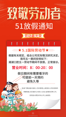 杭州湘湖口腔五一假期放假安排 杭城看牙记 • 2022年5月1日 20:23 • 杭州看牙动态 5.1国际劳动节根据有关规定,结合公司实际情况研究决定,我司五一期间安排如下:湘湖口腔五一劳动节期间不放假,正常接诊。营业时间:8:00-20:00假日期间有需要看牙的可提前一天预约避免久等 各部门要加强对值班人员的管理,认真落实公司突发事件预案制度,切实做好公司防火安全疫情防控等工作发现苗头要及时向公司上级报告 来源:杭州湘湖口腔 本文内容源自网络仅供参考,不作为诊断医疗依据,更多查询请 → 在线咨询客服
