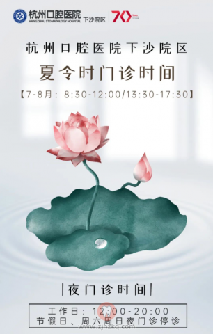 杭州口腔医院下沙院区上下班时间调整 杭城看牙记 • 2022年6月27日 16:59 • 杭州看牙动态 夏令时门诊时间调整公告如下图 温馨提示:夏日炎热,注意防暑;为减少候诊时间,建议大家提前预约哦! 杭州口腔医院建于1952年,是中国**大学和浙江中医药**。 杭州口腔医院下沙门诊部,地址:杭州市金沙大道201号财通中心3楼。 本文内容源自网络仅供参考,不作为诊断医疗依据,更多查询请 → 在线咨询客服