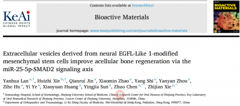 近日,**谢志坚教授团队在Bioactive Materials杂志上发表了题为Extracellular vesicles derived from neural EGFL-Like 1-modified mesenchymal stem cells improve acellular bone regeneration via the miR-25-5p-SMAD2 signaling axis文章。