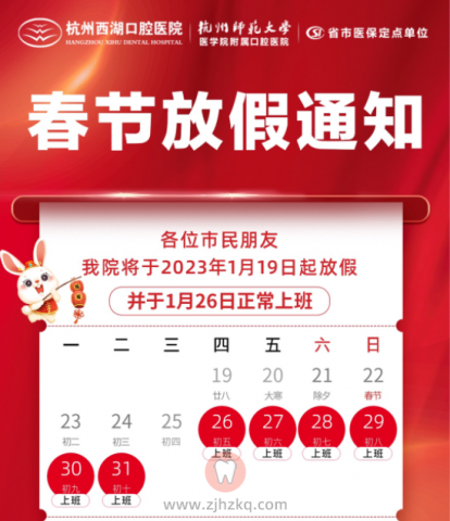 杭州西湖口腔医院2023年春节放假时间安排 杭城看牙记 • 2023年1月17日 14:45 • 杭州看牙动态 杭州西湖口腔医院重要的春节放假通知如下: 提前祝大家新年快乐,虎年吉祥。 来源:杭州西湖口腔医院 本文内容源自网络仅供参考,不作为诊断医疗依据,更多查询请 → 在线咨询客服