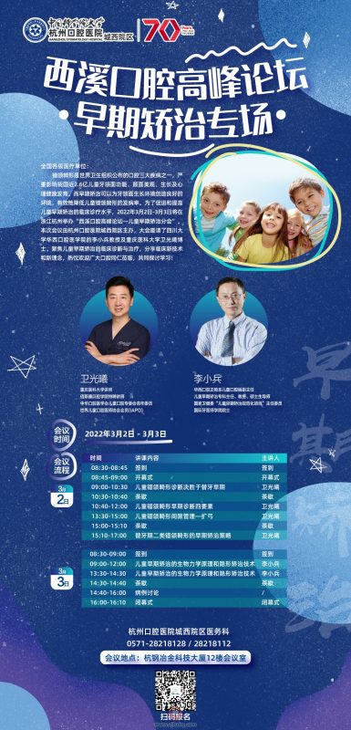 杭州口腔医院城西院区积极搭建学术交流平台,旨在促进和提高儿童早期矫治的临床诊疗水平,2022年3月2日-3月3日将在浙江杭州举办“西溪口腔高峰论坛——儿童早期矫治分会”。