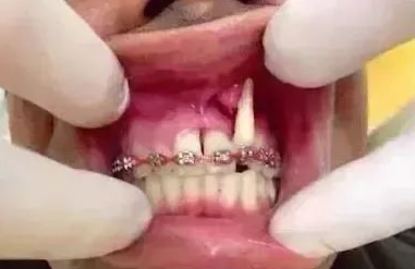 从图中可以清晰的见到,他的22牙已经完全从唇侧脱出,11,12牙龈退缩。这段“DIY正畸闹着玩儿之路”基本上全部垮掉~