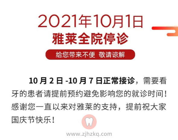 杭州雅莱口腔国庆节放假门诊安排 杭城看牙记 • 2021年9月30日 17:11 • 杭州看牙动态 2021年10月1日雅莱全院停诊,10月2日-10月7日正常接诊,需要看牙的患者请提前预约避免影响您的就诊时间!感谢您一直以来对雅莱的支持,提前祝大家国庆节快乐! 给您带来不便 敬请谅解 本文内容源自网络仅供参考,不作为诊断医疗依据,更多查询请 → 在线咨询客服