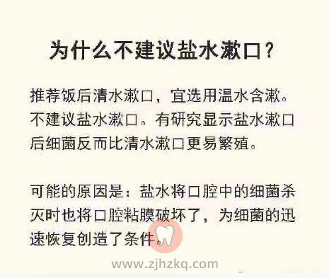 盐水漱口靠谱吗? 杭城看牙记 • 2021年2月9日 22:56 • 看牙科普攻略 杭州网友问,盐水漱口靠谱吗? 科普时间到:为什么不建议盐水漱口,如下图。 本文内容源自网络仅供参考,不作为诊断医疗依据,更多查询请 → 在线咨询客服