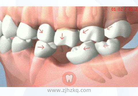 牙齿是互相依靠排排站的,一颗牙齿长期“缺勤”,足以导致周围牙齿先后“下岗”,对颌牙逐渐伸长,邻牙向缺牙间隙倾斜,继而导致食物嵌塞,引发龋齿和牙结石堆积。
