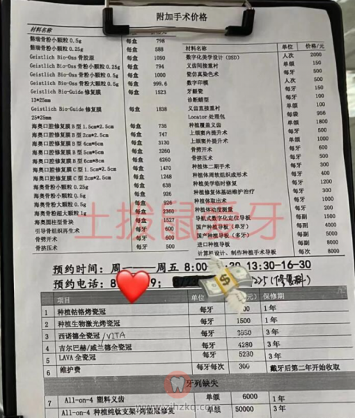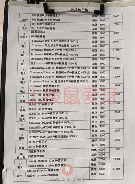 我们找到两张网友分享的浙江**的报价图,如上图,其医生手术看价目表是和种植体一起收费的;如果我们所有材料都选最贵:种植体NOBEL(active)13500+Lava全瓷冠5280+其他杂费大约2000≈20780;也就是浙江**最贵的种植牙大概就是2W左右!