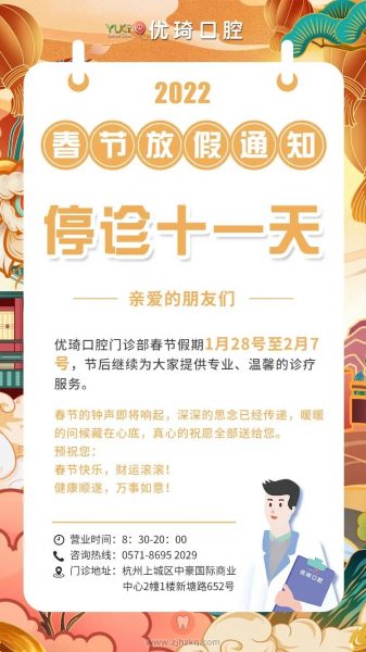 优琦口腔2022年春节放假时间 杭城看牙记 • 2022年1月25日 19:57 • 杭州看牙动态 春节放假时间 2022年1月28日—2月7日春节放假2月8日(初八)正常开诊放假期间给大家带来的不便敬请谅解! 优琦口腔全体工作人员祝大家春节快乐,虎年吉祥~ 注意事项:特殊时期,请大家做好防护,勤洗手,多通风,戴口罩。 本文内容源自网络仅供参考,不作为诊断医疗依据,更多查询请 → 在线咨询客服