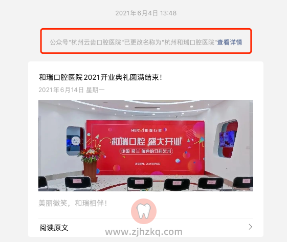 公众号”杭州云齿口腔医院”已更改名称为”杭州和瑞口腔医院”