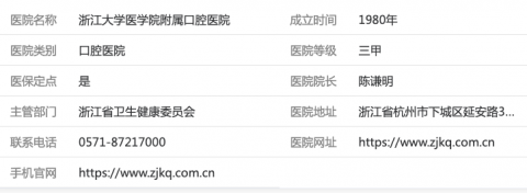 经查资料,浙江**口腔医院(浙江**)位于浙江省杭州市下城区延安路395号,始建于1980年,建筑面积约7万平方米,是一所集医疗、教学、预防、康复于一体的**口腔专科医院,是浙江省、杭州市医保和新农合定点医院,是浙江**质控中心、浙江**卫生指导中心、浙江**正畸中心、浙江**种植技术指导中心、浙江**医学会会长单位,是国家住院医师规范化临床培训基地、国家医师资格考试实践技能考试基地,是浙江**医学重点培育专科建设医院,曾荣获浙江省文明单位等荣誉称号。