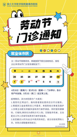 4月30日(星期六)至5月2日(星期一)门诊停诊,急诊和产科加强,5月3日(周二)起正常上班。